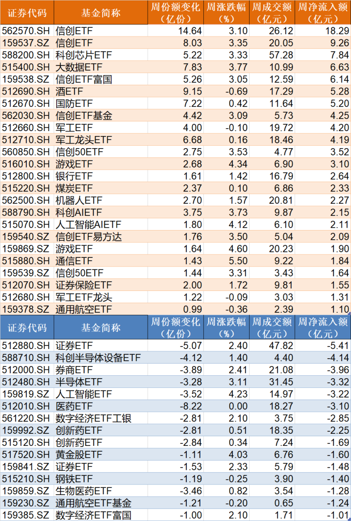 在行业主题ETF方面,本周净流入资金超1亿元的基金有24只,其中信创ETF(562570)、信创ETF(159537)和科创芯片ETF分别增加了14.64亿份、8.03亿份和5.22亿份,净流入资金18.29亿元、9.26亿元和7.84亿元。