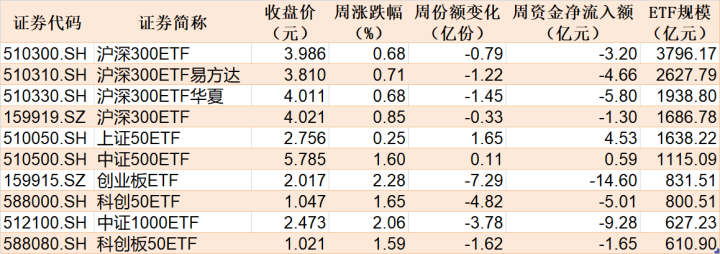 本周市场主要股指集体上涨,规模较大的ETF中,创业板、中证1000等相关ETF涨超2%。