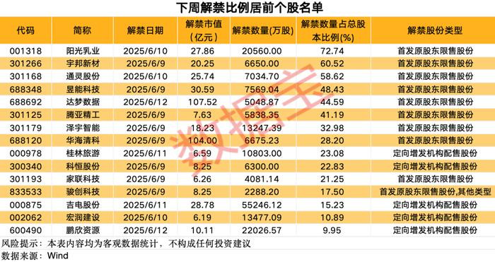 个股中,阳光乳业解禁比例为72.74%,居首;宇邦新材、通灵股份解禁比例分别为60.52%、58.62%。从解禁股类型来看,上述3股均为首发原股东限售股份解禁。